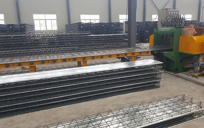 鋼筋桁架樓承板是混凝土澆制樓板的升級或替代產品。該產品是將樓板中的鋼筋在工廠加工成鋼筋桁架,并將鋼筋桁架與鍍鋅壓型鋼板底模焊接成一體的組合模版。在施工階段,鋼筋桁架樓承板可承受施工荷載,直接鋪設到梁上,進行簡單的鋼筋工程,便可澆筑混凝土。由于完全替代了模版功能,減少了模版架設和拆卸工程,大大提高了樓板施工效率。